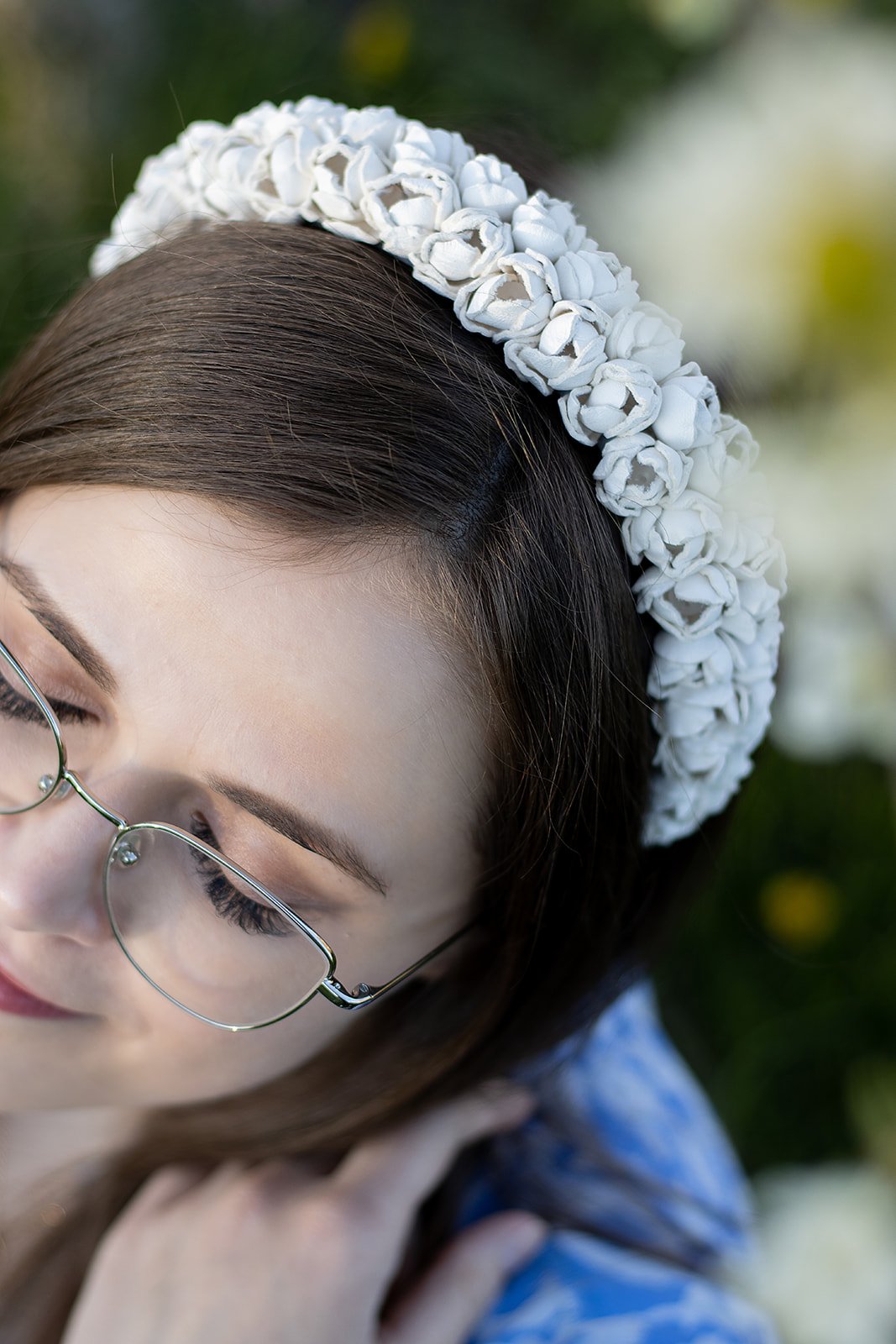 Enhance your look with our elegant white headband, featuring two rows of 100% leather flowers, delicate glass beads, pearls, and lava beads, all beautifully finished with satin. This timeless accessory is crafted in one size to suit all, making it a versatile addition to any wardrobe. Ideal for adding a touch of refinement to both everyday and formal outfits.